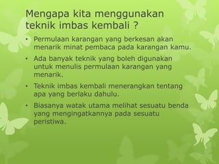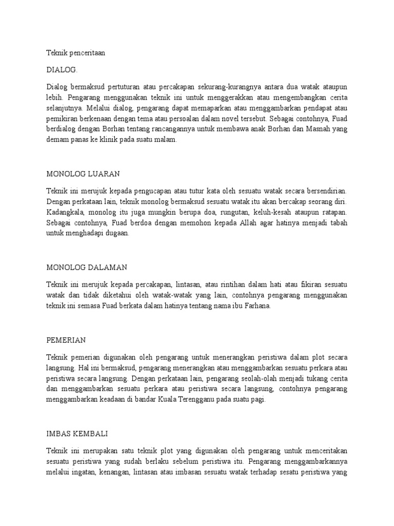 . Teknik penceritaan ialah cara seseorang pengarang mempersembahkan karyanya agar menjadi lebih menarik dan berkesan. Teknik imbas kembali menerangkan tentang apa yang berlaku dahulu. Teknik imbas kembali.