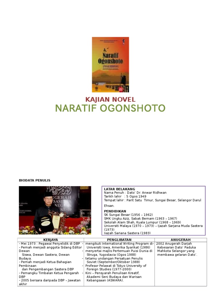 Sinopsis NOVEL NARATIF OGONSHOTO karya Anwar Ridhwan Ogonshoto kepulauan emas Nota. By FaizahaniRafitulAnuar Updated. Sinopsis bab 9 - novel Naratif Ogonshoto.